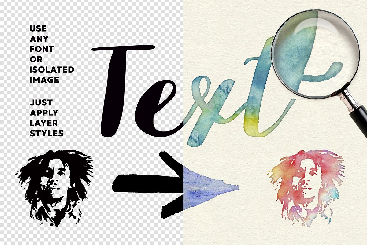 此素材不仅适用于文本,而且适用于任何图形,例如,您可以制作徽标、刻字、名片或邀请函。只需单击几下,即可创建逼真的水彩纹理效果。非常适合画家和设计师使用!根据水彩效果创建新鲜而精彩的项目!使用“滤镜-变形”-“波纹”可获得更逼真的水彩边缘。更改、混合和添加新颜色以获得更好的效果。