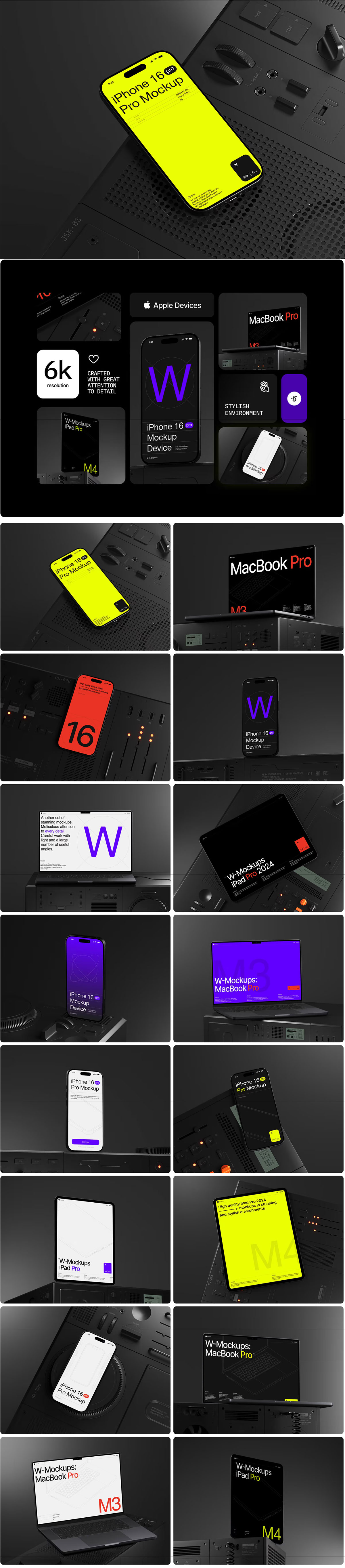 Apple 设备,提升您的演示文稿。这套高级模型包含 16 个精美的模型场景,展示了最新的 iPhone 16 Pro、MacBook Pro M3 和 iPad Pro M4,所有场景均设置于时尚现代的环境中。
