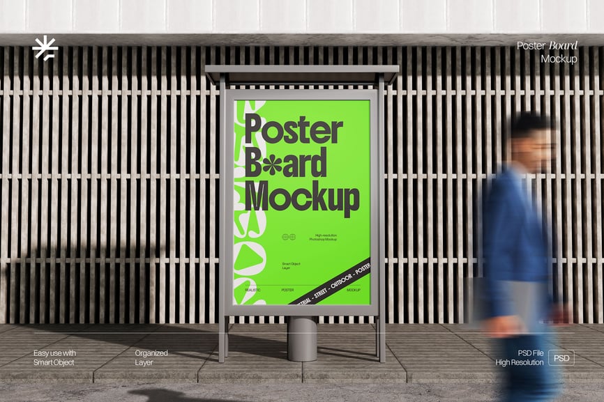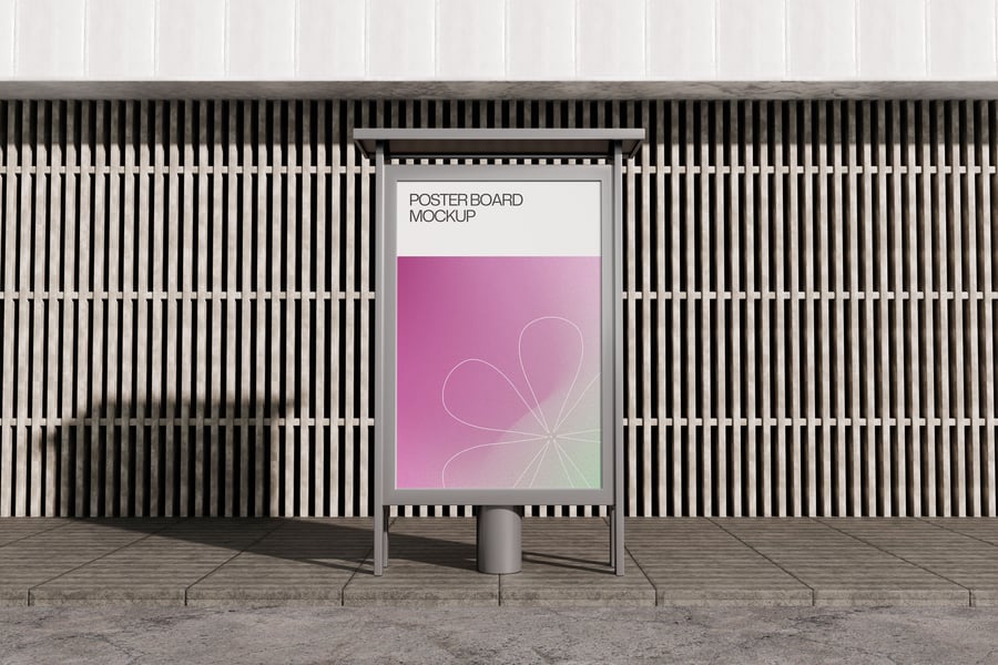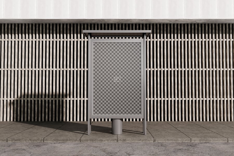 这款竖版海报板模型以时尚的工业风呈现,捕捉了城市广告的精髓。它位于一个现代化的公交车站,背景墙以结构清晰的建筑为背景,简洁而又充满活力,是品牌推广、促销和公共宣传的理想场所。逼真的户外灯光和微妙的阴影增强了真实感,而行人行进的动态则营造出一种自然的街头生活氛围。