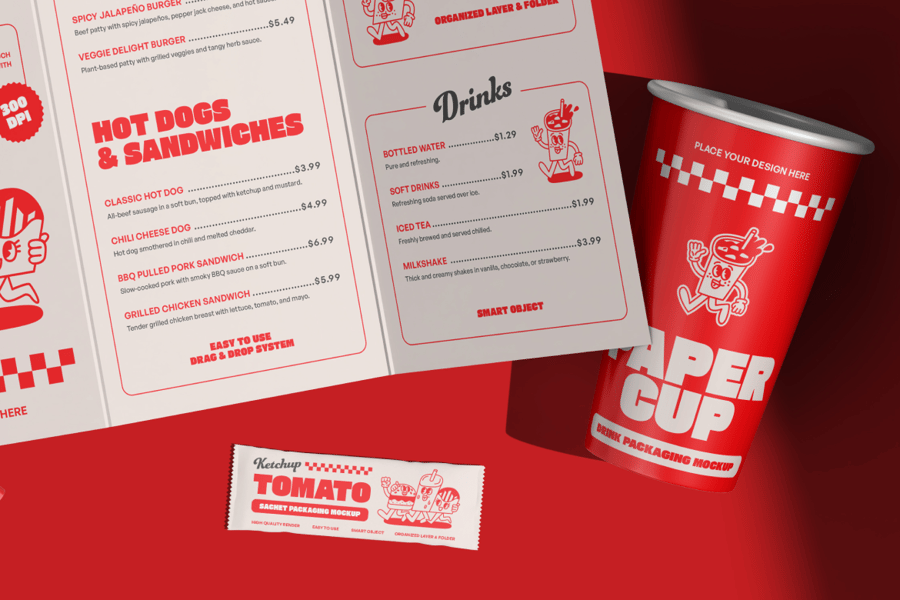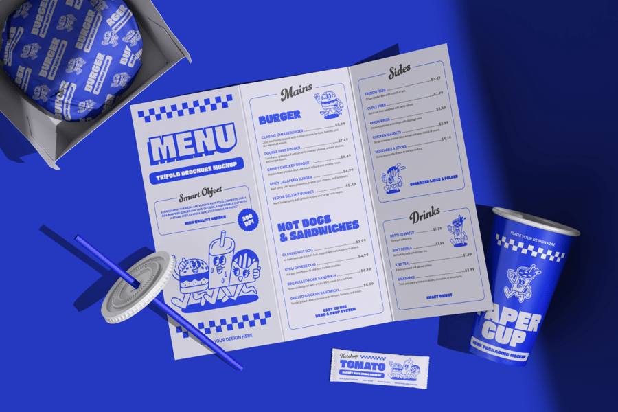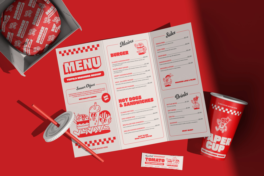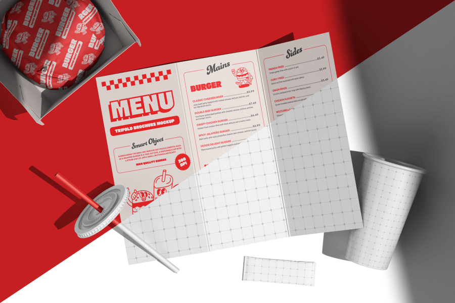 这款**快餐菜单及包装模型**呈现了一个高品质的单一场景,其中包含三折菜单以及可自定义的快餐元素。它非常适合餐厅品牌展示,您可以轻松更新菜单设计、更改吸管颜色,并使用智能对象图层替换杯子和汉堡包装图案。这款 PSD 文件非常适合展示充满活力和趣味的食品品牌形象,其专业的布局能够提升您的客户演示效果。