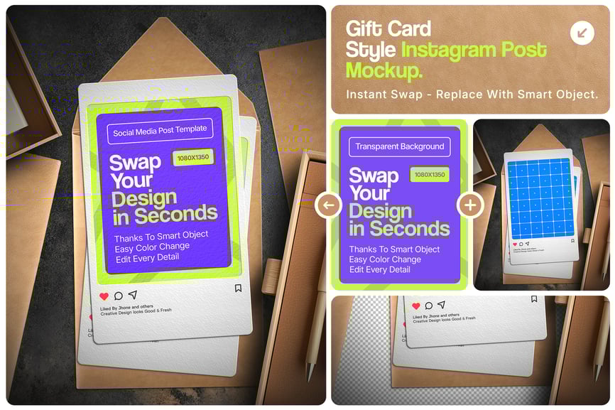 **我们隆重推出礼品卡风格的 Instagram 帖子样机,专为展示您的创意帖子、广告和品牌理念而设计,布局时尚优雅,灵感源自礼品卡。这套功能丰富的模板集合为您提供了一个完美的平台,让您以高端专业的形象展示您的社交媒体设计。这款独特而引人入胜的设计套装旨在提升您的在线形象,让您的内容在每个动态中都闪耀夺目**