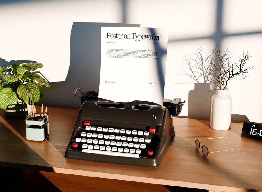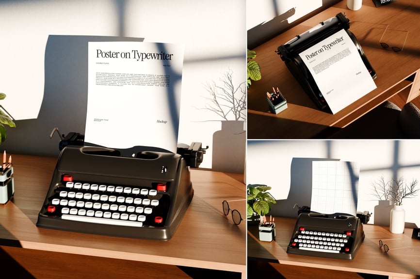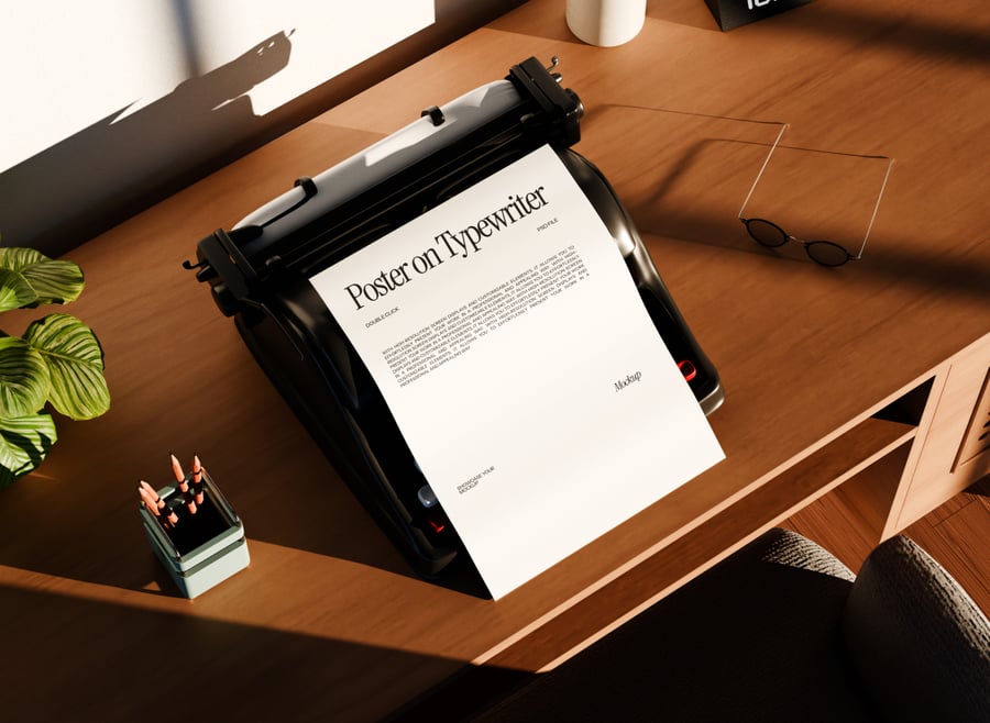 使用**打字机海报模型**,放大您的创意品牌。立即下载,制作**逼真的海报品牌视觉效果**,融合复古打字机的魅力、A4 纸的纹理美感和大胆的复古设计,打造出众的传单、文具和创意作品集宣传。