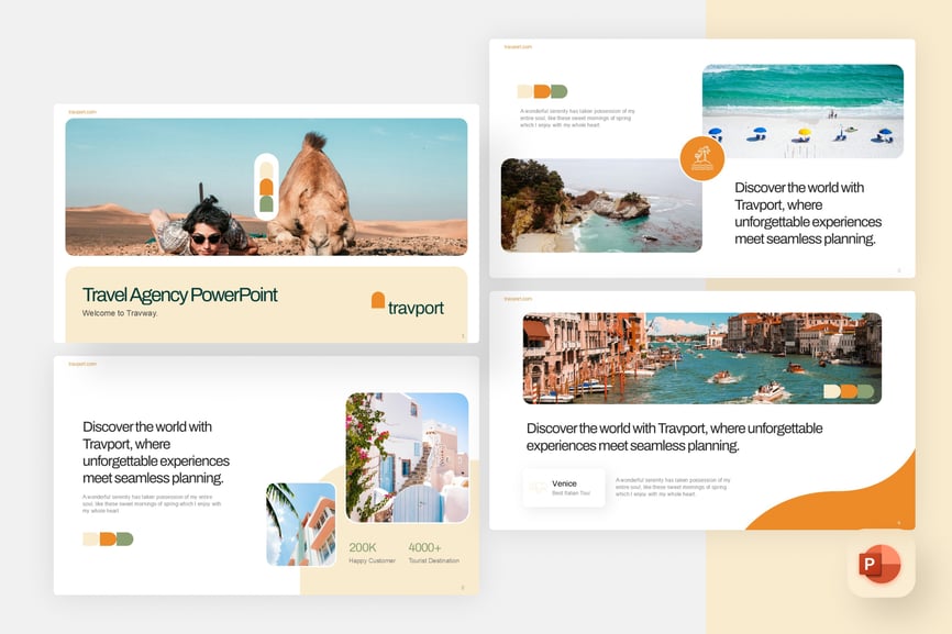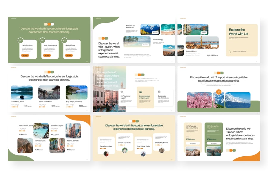 Travport 是一款设计精美的旅行社 PowerPoint 模板,专为旅行社、目的地营销人员和旅行社打造。该模板采用柔和的配色方案和井然有序的幻灯片,让您能够以简洁、现代且极具说服力的格式展示目的地、旅行套餐、机票和酒店预订、季节性优惠和客户评论。无论您是向客户推销、开展活动,还是展示数据驱动的旅行趋势,Travport 都能确保您从出发到抵达的整个过程中拥有流畅的视觉体验。
