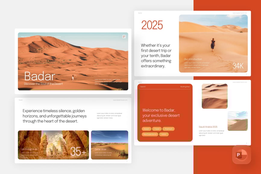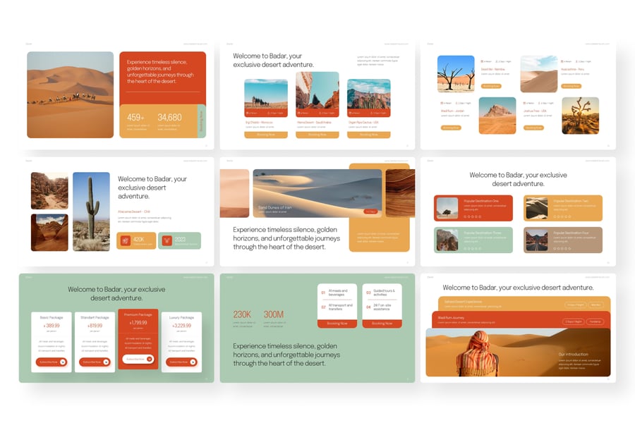 探索与发现旅行 PowerPoint 模板专为奢华旅行社、沙漠度假村和旅行社设计,旨在展现令人难忘的沙漠体验。该演示文稿采用温暖的大地色调,包含直观的数据可视化、旅行者评价和套餐比较,非常适合推广专属导览游、全包套餐和文化探索。它非常适合推广沙漠旅游项目、开展营销活动或向旅游行业的利益相关者展示数据洞察。