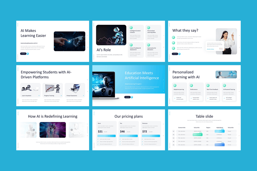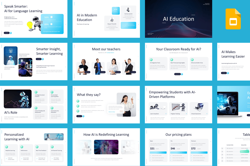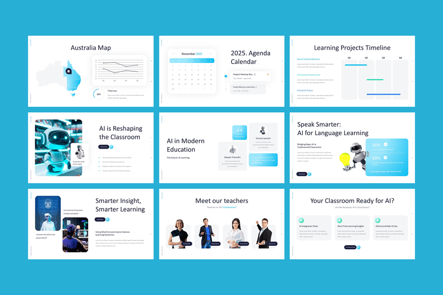 人工智能教育 Google 幻灯片演示模板是一款现代、专业且完全可定制的幻灯片,专为探索人工智能世界的教育工作者、培训师和技术爱好者设计。该模板拥有流畅的布局、生动的视觉效果和直观的信息图表,可帮助您就人工智能概念、机器学习、数据科学和未来教育技术进行引人入胜的演示。该模板非常适合学术讲座、在线课程、研讨会、工作坊和人工智能项目展示,包含预先设计的内容结构、可编辑的图表和简洁的排版,确保您的想法脱颖而出。其拖放式图像占位符和母版幻灯片使自定义变得快速而轻松,为您节省数小时的设计工作时间。