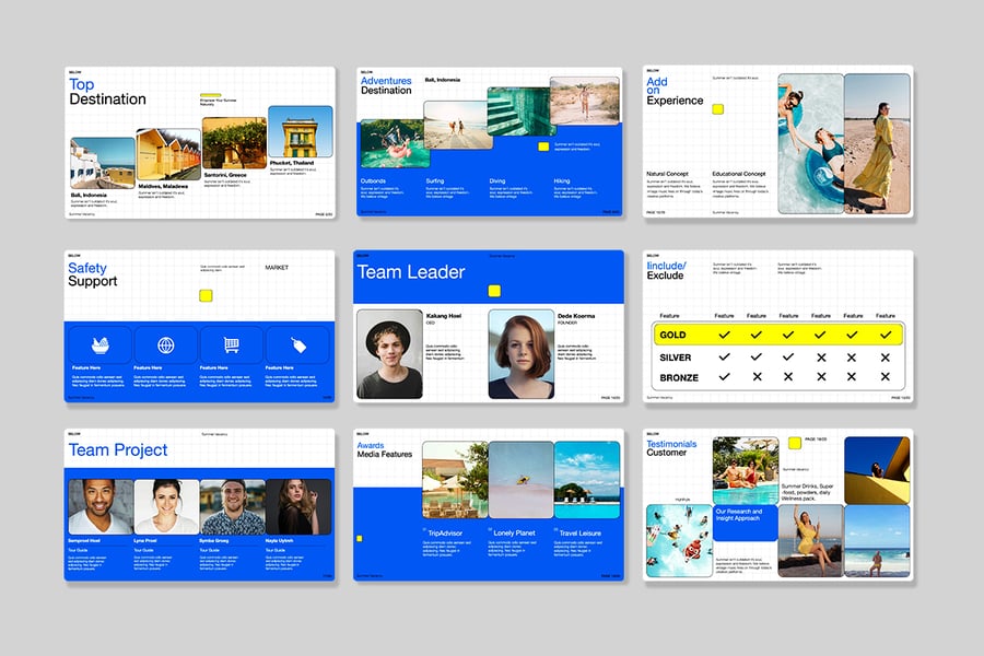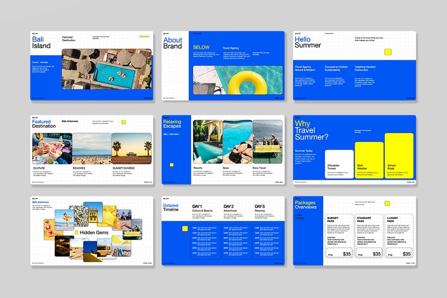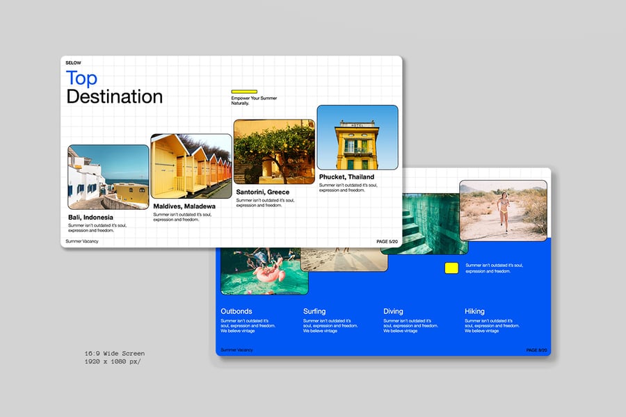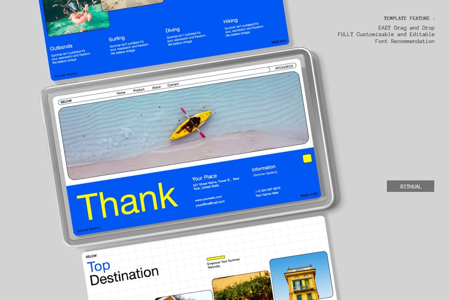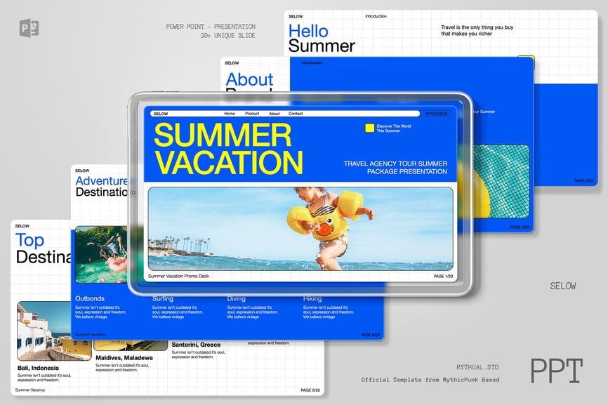 这个“蓝色夏季旅行社演示文稿 Powerpoint – Selow”旨在推广您的任何创意业务!