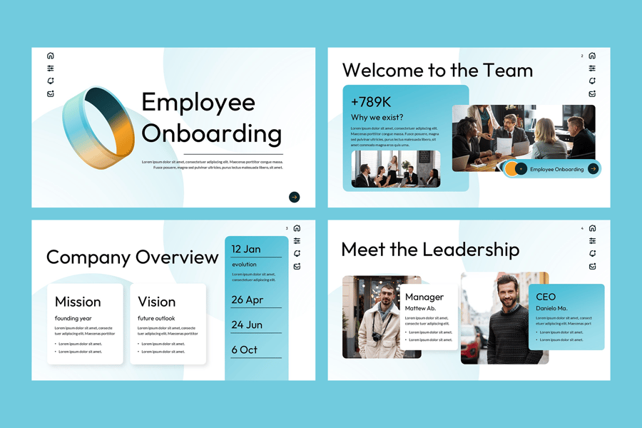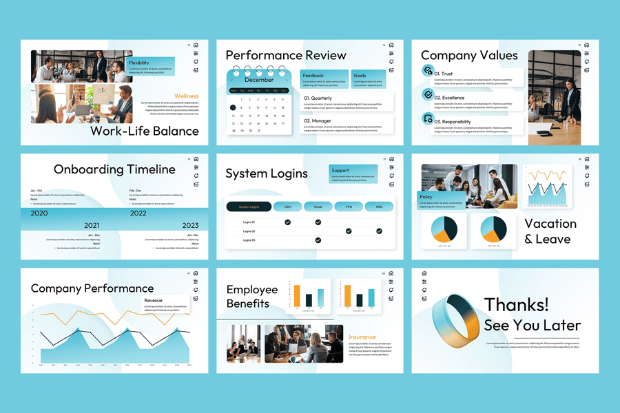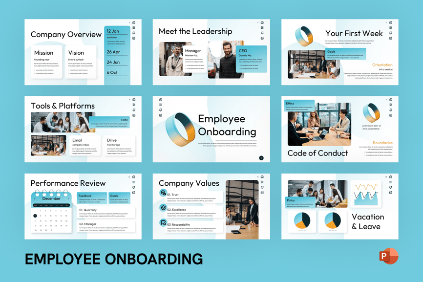 无论您是在办公室还是远程入职,这款 PowerPoint 模板都能确保您每次都能获得一致且精美的演示文稿。使用此模板打造引人入胜的宣传方案,其中包含专业设计的幻灯片,可展示您业务的各个关键方面,从公司概况到问题解决方案分析。其现代化的布局、可视化的图形和可编辑的图表,让您轻松讲述故事并有效地可视化数据。它可完全定制以适应任何行业,让您能够打造引人入胜且卓有成效的宣传方案。适用于人力资源部门、企业培训团队、初创公司创始人、远程入职演示和公司介绍演示文稿。