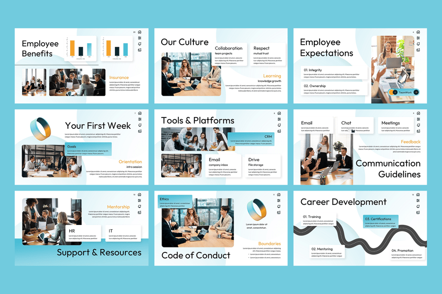 这款专业的员工入职 PowerPoint 演示文稿模板可助您提升人力资源战略,非常适合欢迎新员工、简化入职流程以及展示公司文化。这款简洁、现代且完全可编辑的模板旨在帮助人力资源专业人士、团队领导和企业培训师打造流畅的入职体验。凭借引人入胜的布局、信息图表、时间线和清单,您可以轻松展示公司价值观、政策、团队结构和培训计划。