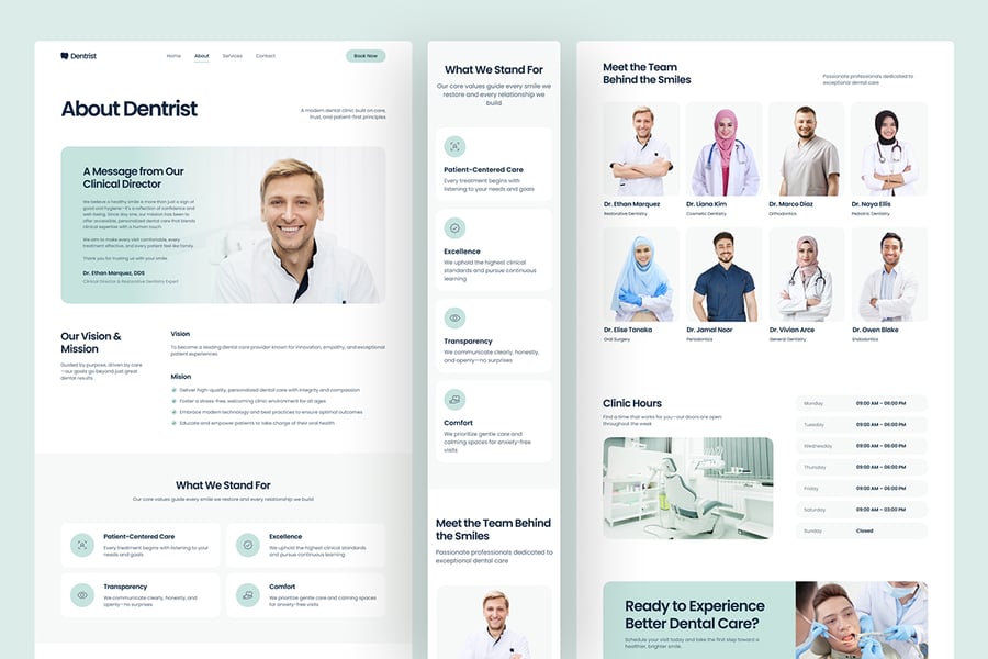 + **以团队和故事为中心的关于页面:**通过友好且可建立信任的布局展示诊所价值观、使命和您的牙科团队。