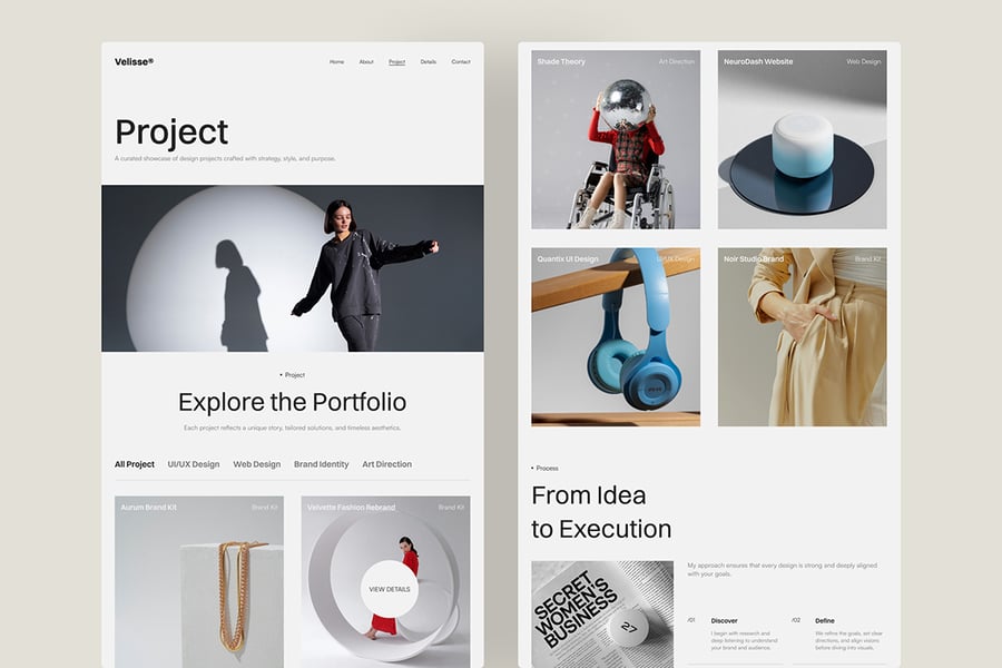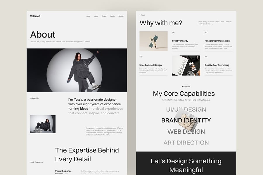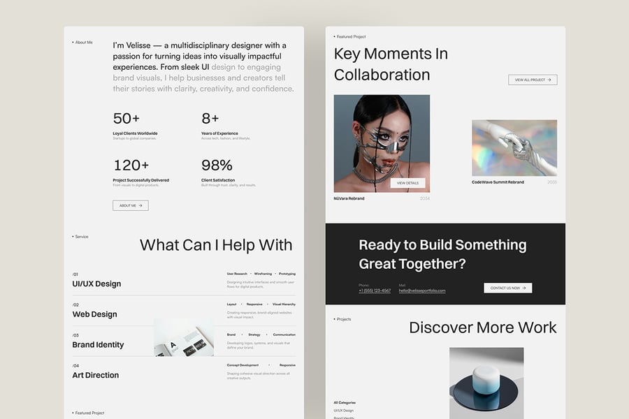 Velisse 以创意为核心,在美观性、易用性和叙事性之间取得平衡。其周到的设计选择让您轻松打造强大的在线形象,不仅外观精美,更能引起客户和合作伙伴的共鸣。无论您是展示设计案例研究,还是讲述您的职业故事,Velisse 都能助您打造令人难忘、富有策略性且独一无二的作品集。