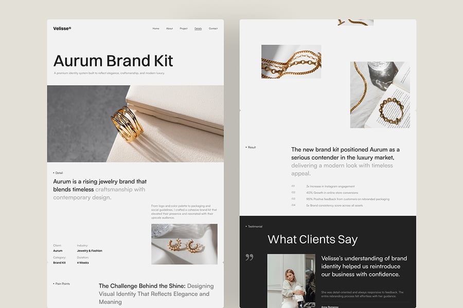 + **详细的项目案例研究布局**:项目详细信息页面旨在讲述深入的故事,具有挑战-解决方案-结果格式、视觉效果和推荐,以传达您的创意影响。