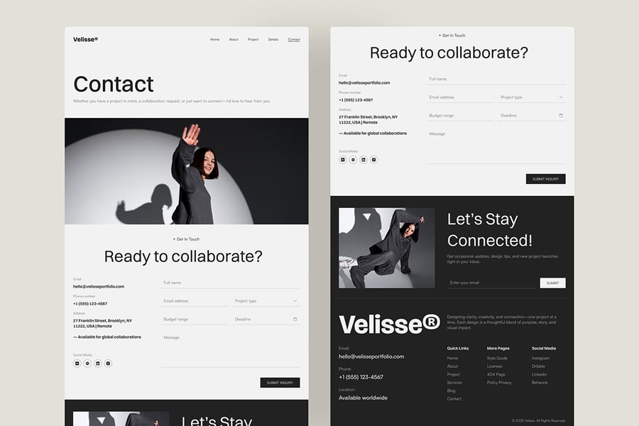 + **简化的联系页面**:鼓励潜在客户或合作者通过简洁诱人的布局与我们联系,其中包含社交链接、表单和联系方式。