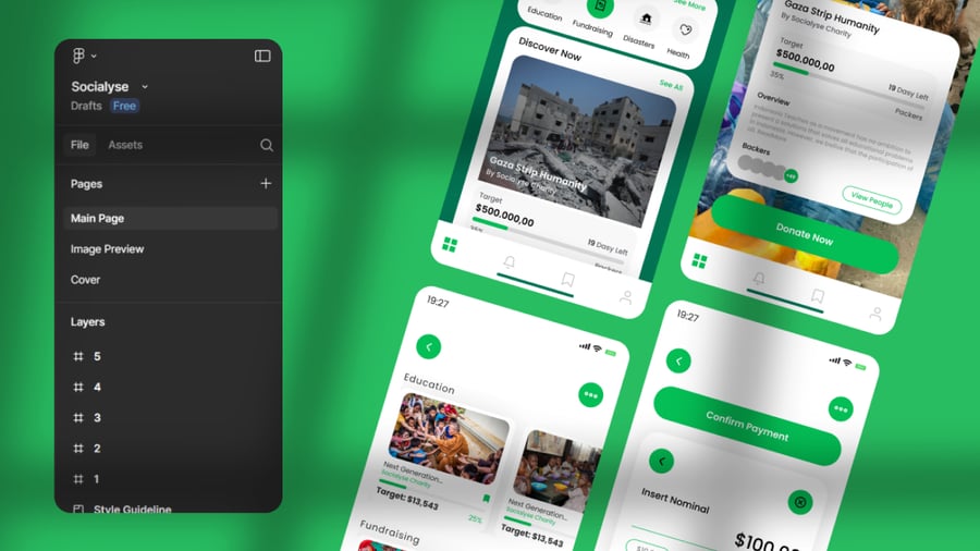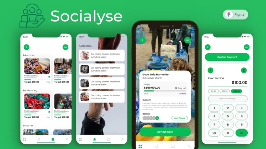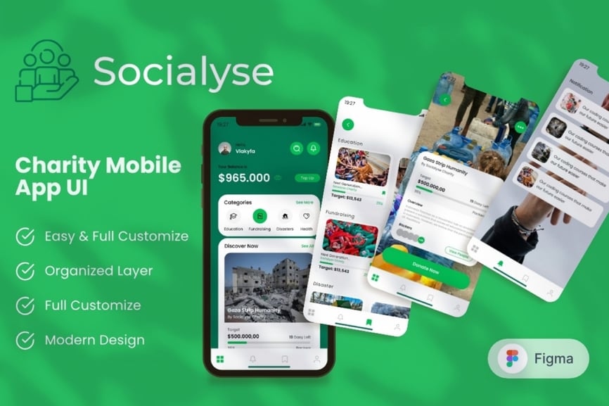 Socialyse – 慈善移动应用 UI 套件,设计简洁、色彩丰富、现代感十足,并包含高质量的屏幕。它非常实用,并且易于完全定制以满足您的需求。易于在 Figma 中使用。