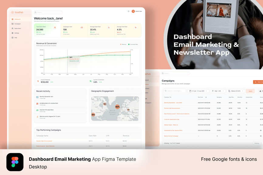 电子邮件营销仪表盘模板采用 Figma 设计,简洁现代,专为电子邮件营销平台、代理机构或 SaaS 企业打造。它包含两个基本页面:一个用于跟踪营销活动效果的分析仪表盘,以及一个用于清晰管理和监控电子邮件活动的营销活动表格。非常适合需要为电子邮件营销应用提供即用型 UI 组件的设计师、开发者和初创公司。