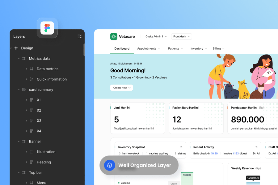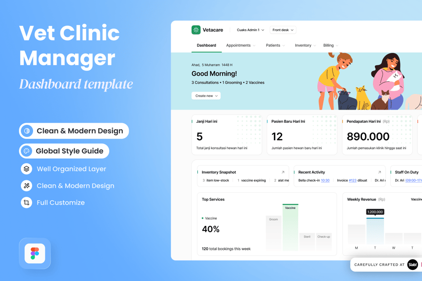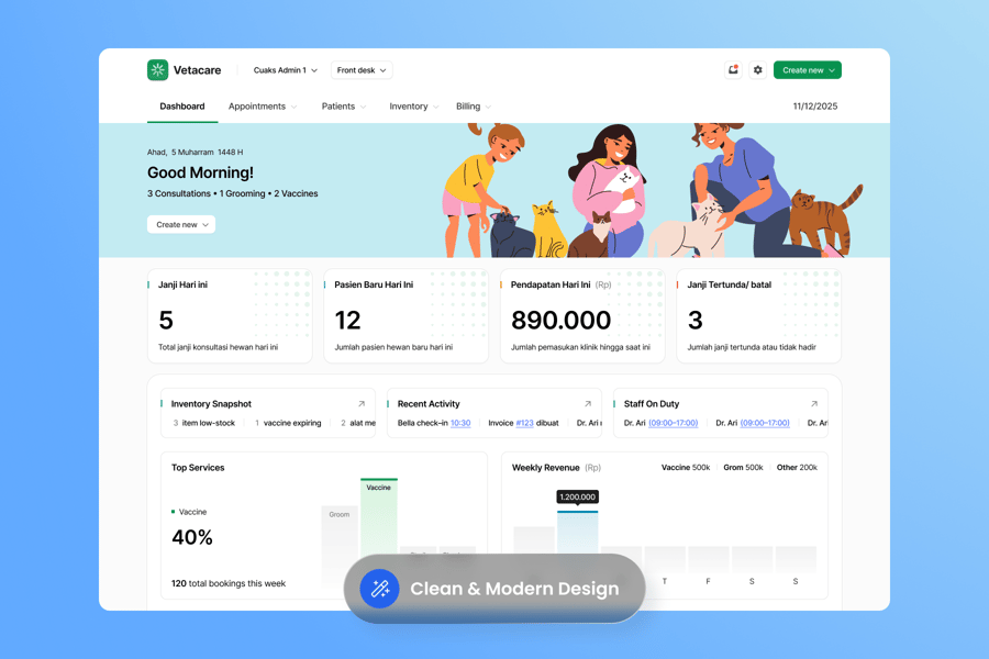VetCare Dashboard 是一款专为兽医诊所设计的现代化、直观的管理面板。从追踪患者就诊到管理宠物健康记录,VetCare 可帮助您的诊所平稳高效地运营,并全面掌控日常运营。