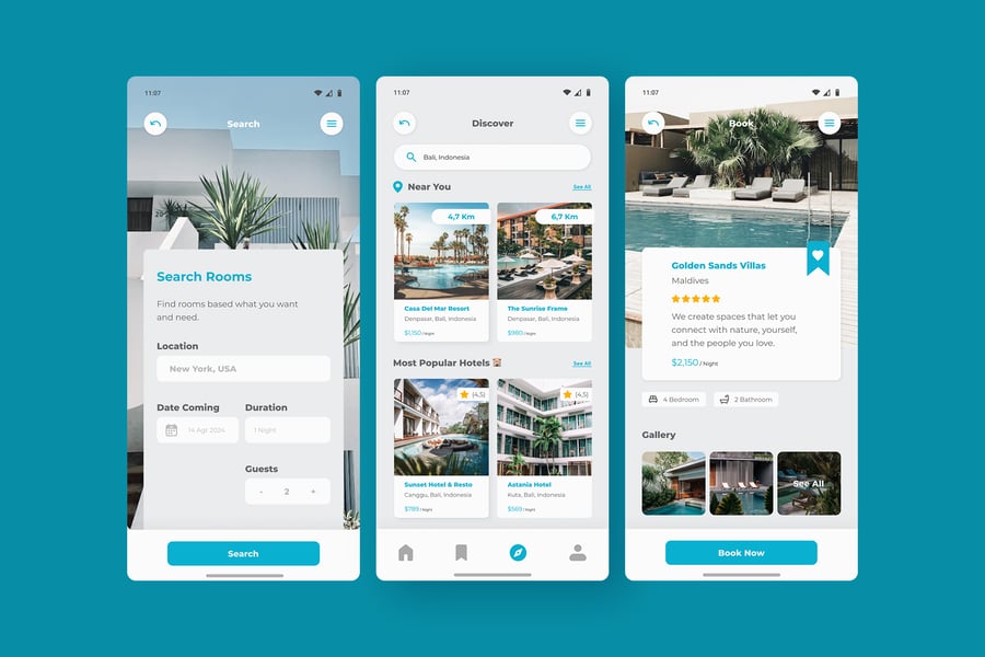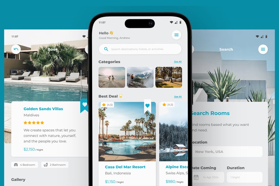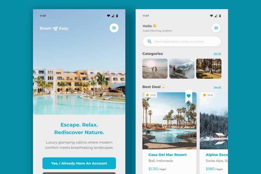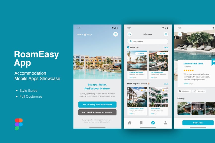 **RoamEasy** 是一款用于数字酒店或度假村预订管理项目的住宿移动应用程序,由于其矢量形状和组织良好的图层,易于编辑、定制和调整大小。