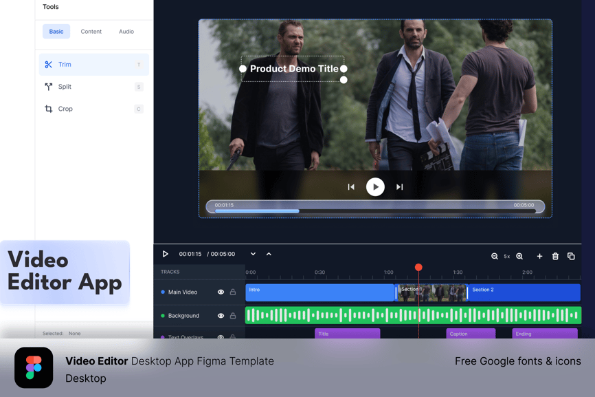 一个用于视频编辑器仪表盘应用的现代 Figma 模板,其设计模仿了专业的编辑工具。布局包含简洁的视频预览区域、用于精确编辑的分层时间线以及直观的控件,非常适合展示 UI/UX 概念或启动视频软件项目。
