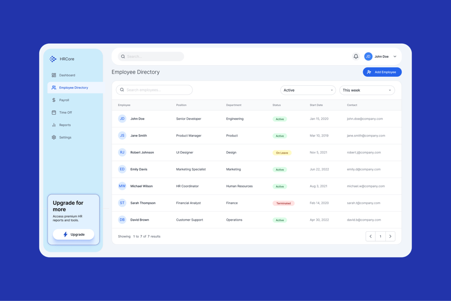 *员工目录页面——结构化的表格布局,用于管理员工详细信息,例如姓名、角色、部门、联系信息和状态。