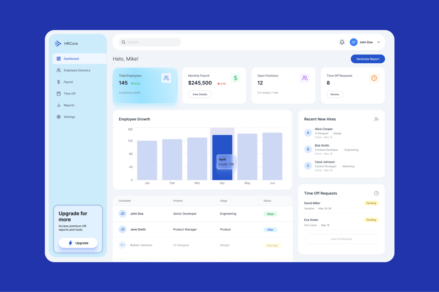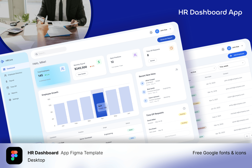 一个简洁现代的 UI 模板,专为人力资源团队设计,方便轻松管理员工。此 Figma 文件包含两个关键页面: