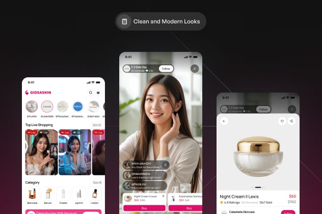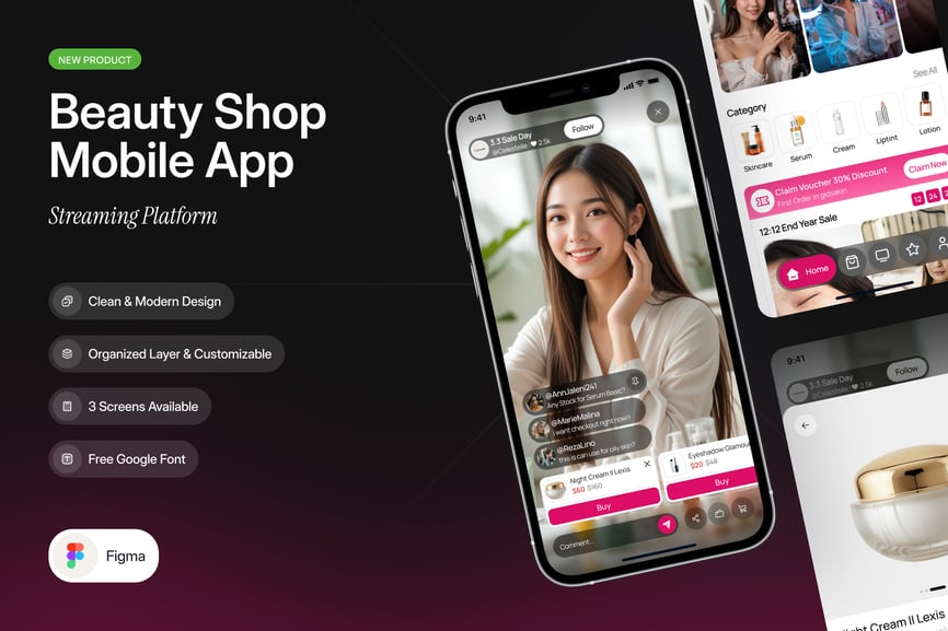 这款移动应用 UI 套件专为希望将购物与互动体验相结合的美妆店和直播平台而设计。它拥有简洁现代的界面,非常适合展示美妆产品、通过直播吸引观众,并支持无缝结账。