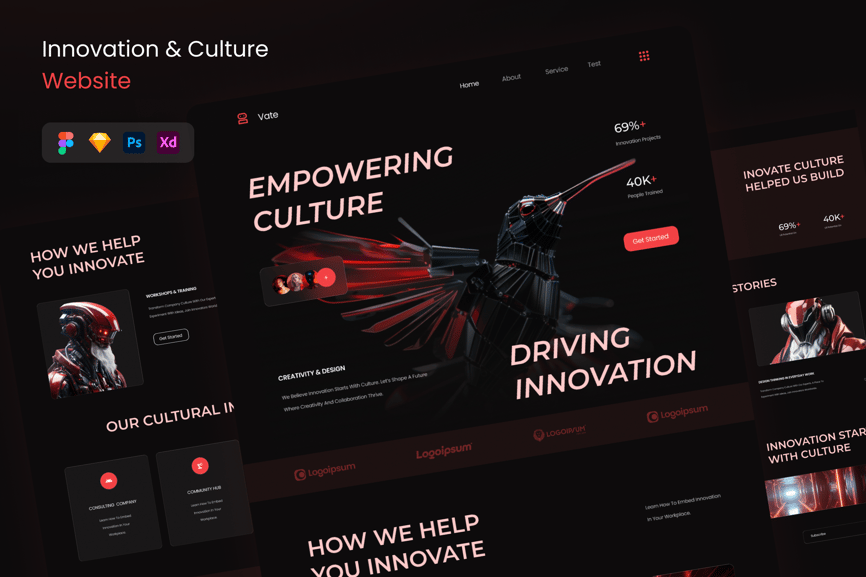 *Vate – 创新与文化网站* 此模板简洁却不失专业现代感。您可以使用 Figma、Adobe XD、SKETCH 和 Adobe Photoshop 进行编辑。轻松插入内容、更改颜色,所有模板均已包含,可随时与您的受众分享。所有组件均基于矢量,完全兼容、可编辑且像素完美。此外,它们组织有序,命名和分组均经过精心设计。