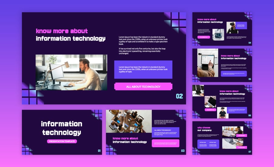 信息技术主题演讲模板布局灵活专业,适合各种内容,尤其适合开发人员、科学家、研究人员以及许多其他行业。该模板格式丰富,易于自定义,可帮助您自信清晰地表达想法。