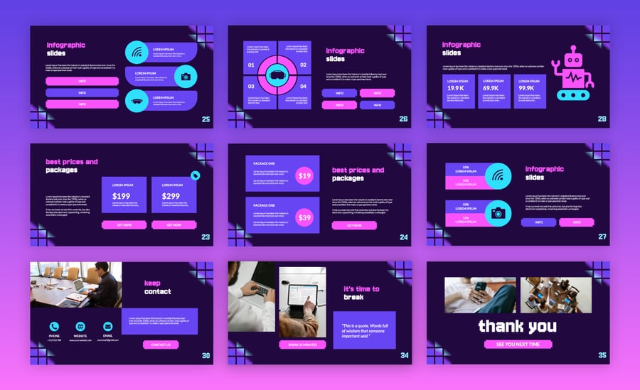 整体设计保持了专业而又平易近人的风格。凭借井然有序的内容块、充足的留白以及精心选择的排版,该模板能够以清晰引人入胜的方式轻松呈现复杂的信息。它包含 35 张独特的幻灯片,设计简洁明了,并具备各种实用功能,例如用于说明数据的图表和图形,以及用于展示视觉效果的拖放式图像占位符。