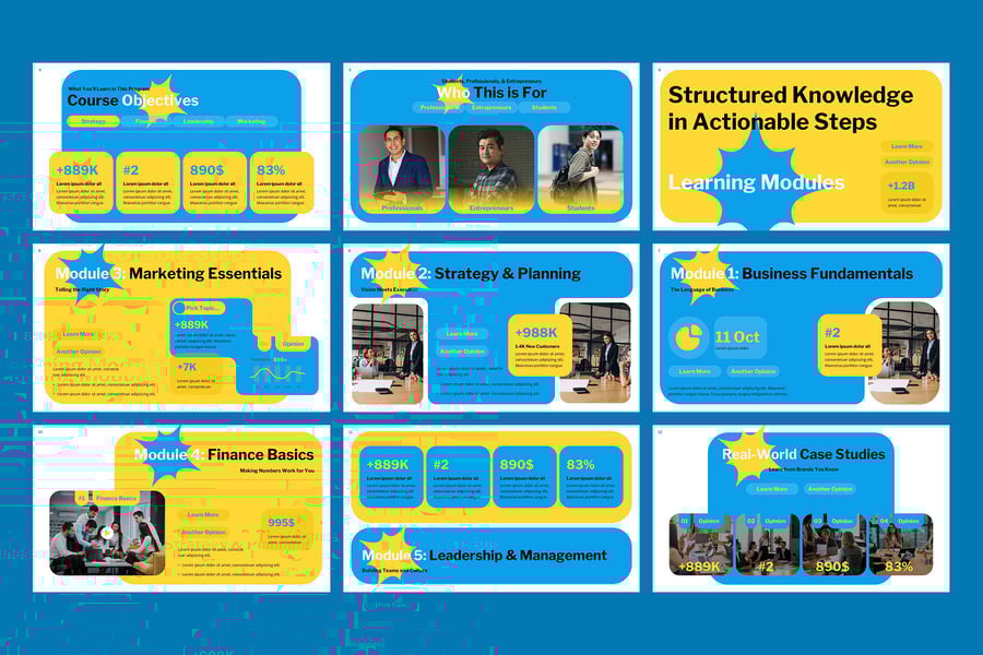 无论您是在准备商业课程、员工培训材料还是企业战略课程,此模板都能完美适配您的内容。使用此模板打造引人入胜的宣传方案,其中包含专业设计的幻灯片,可展示您业务的各个关键方面,从公司概况到问题解决方案分析。其现代化的布局、可视化图形和可编辑图表,让您轻松讲述故事并有效地可视化数据。它可完全定制以适应任何行业,帮助您打造引人入胜、卓有成效的宣传方案。适用于商业教育者、企业培训师、顾问和企业家。