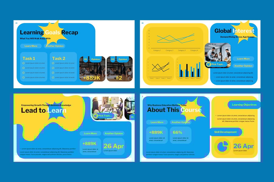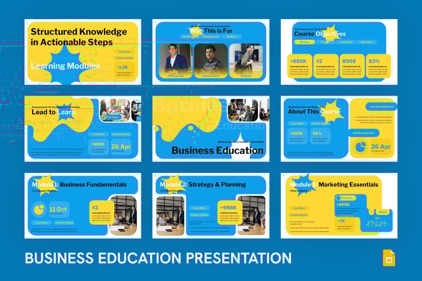 商业教育 Google 幻灯片演示模板是一款现代、专业且完全可定制的幻灯片,旨在提升您的商业培训、教育研讨会和企业学习课程的体验。该模板布局简洁,信息图表引人入胜,幻灯片设计多样,可帮助您进行清晰、有影响力的演示,吸引观众。此外,该模板包含完全可编辑的图表、示意图和视觉元素,可简化复杂的主题。简洁、极简的风格确保您的信息脱颖而出,同时保持精致专业的形象。