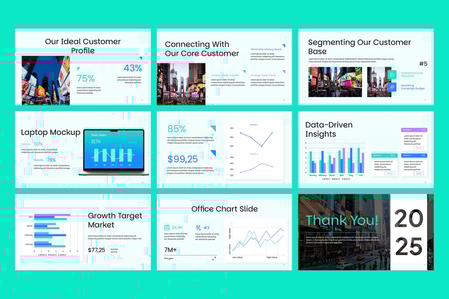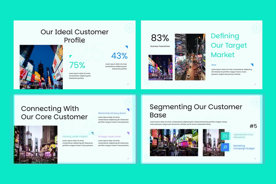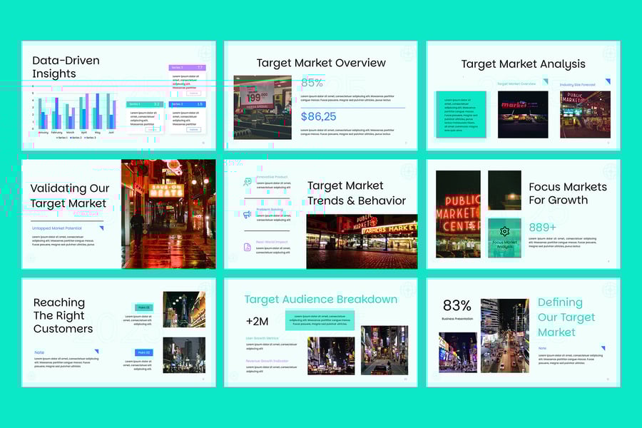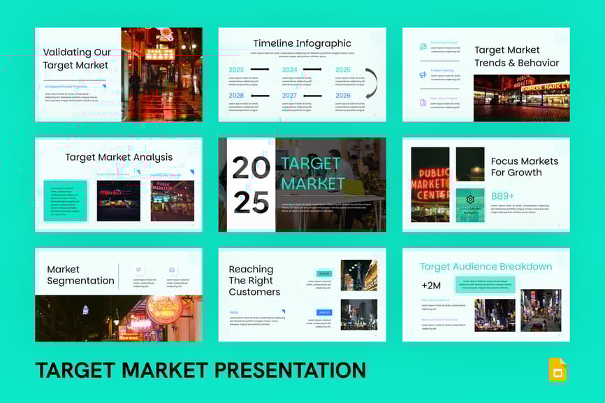 目标市场 Google 幻灯片演示模板是一款现代化、完全可编辑且专业设计的幻灯片,可帮助您清晰地定义、分析和呈现您的理想受众。无论您是向投资者推介、展示营销计划还是制定品牌战略,此模板都能提供简洁的布局、引人入胜的视觉效果和可自定义的信息图表,使您的数据更具说服力且易于理解。凭借独特的幻灯片、基于矢量的图形和拖放式图像占位符,您可以快速调整设计以适应您的品牌。该模板非常适合市场细分、买家画像、竞争分析和销售策略演示。