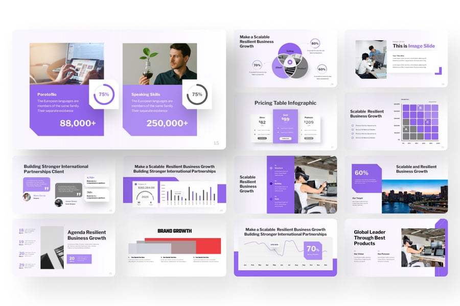 **商业作品集 PowerPoint** 模板是一款现代专业的演示文稿设计,专为展示公司简介、作品集和商业策略而设计。该模板布局简洁,字体醒目,图片和信息图表均衡,可帮助您清晰有效地传达想法。它包含多种用途的幻灯片,例如作品集亮点、价格表、增长图表、信息图表、议程、客户评价和团队介绍。