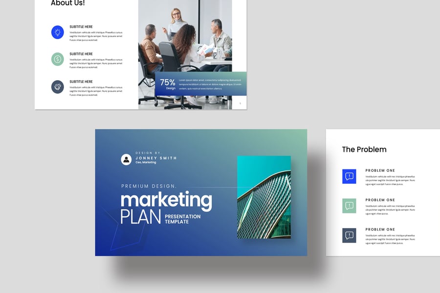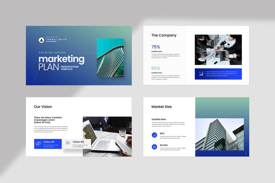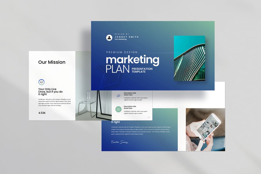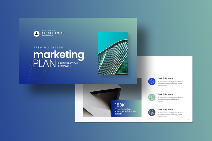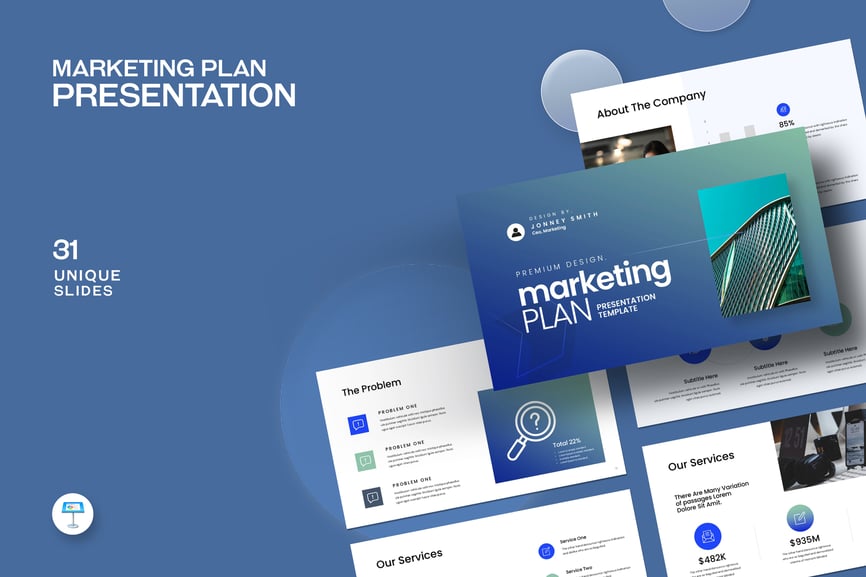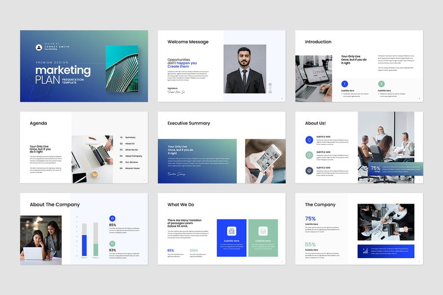 使用营销计划演示模板ate,以专业简洁的方式展示您的作品。这款模板设计简洁现代,功能强大,包含创意照片布局、信息图表、表格、矢量图标、示意图以及大量实用功能,可将您的作品和公司形象提升到全新高度。