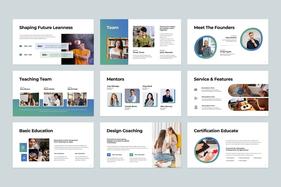 使用 NextGen Educate 演示模板,以专业简洁的方式展示您的作品。这款模板设计简洁现代,功能强大,包含创意照片布局、信息图表、表格、矢量图标、图表以及大量实用功能,可将您的作品和公司形象提升到全新高度。