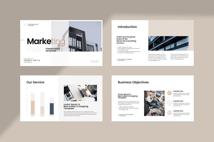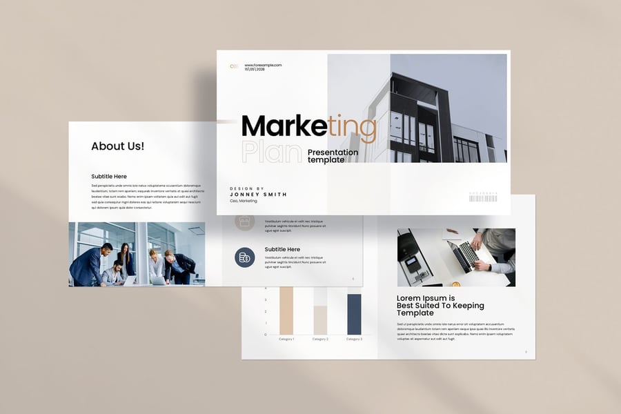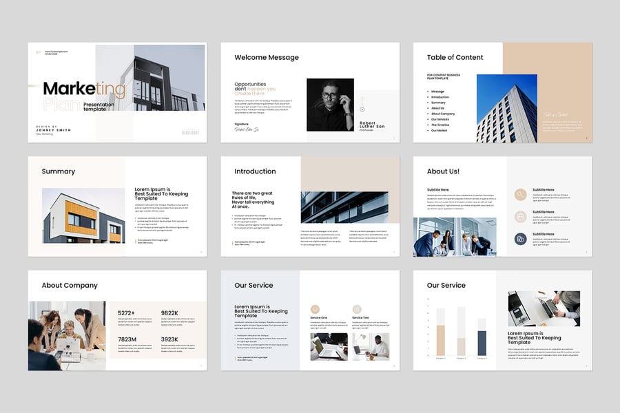 以专业、干净的方式展示您的作品,营销计划演示模板采用简单现代但功能强大的设计,包括创意照片布局、信息图表、表格、矢量图标、图表和大量出色的功能,可在另一个层面上展示您的工作和公司简介。