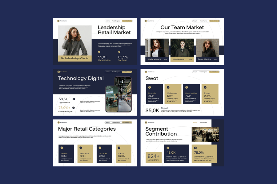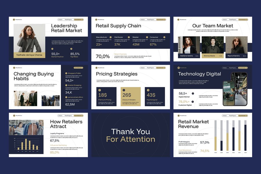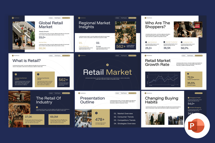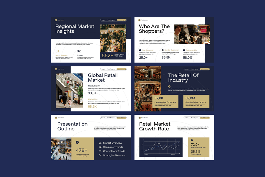 它的主要功能包括数据驱动的信息图表、图表和现代视觉效果,将复杂的零售数据转化为易于理解的洞察,吸引受众。它完全可定制且适应性强,适用于业务回顾、投资者更新、零售战略提案或市场研究报告,是突出增长机会和加强零售行业决策的重要工具。