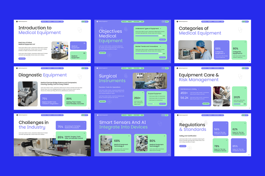 使用医疗设备 Google 幻灯片演示模板展示您的医疗创新和医疗产品。该模板专为医疗保健提供商、医疗产品供应商、生物技术公司和医院演示量身定制,提供专业可靠的设计,以传达您的医疗设备和解决方案的价值。