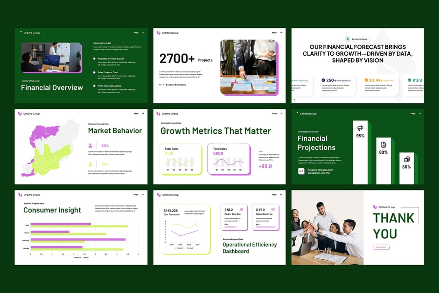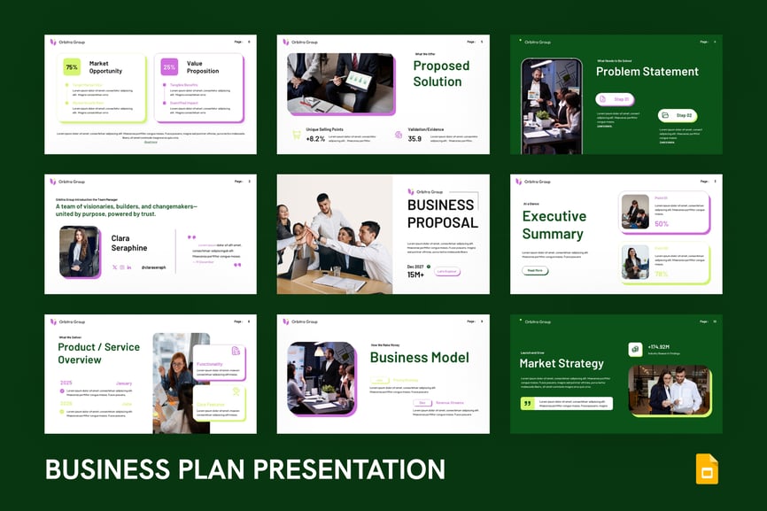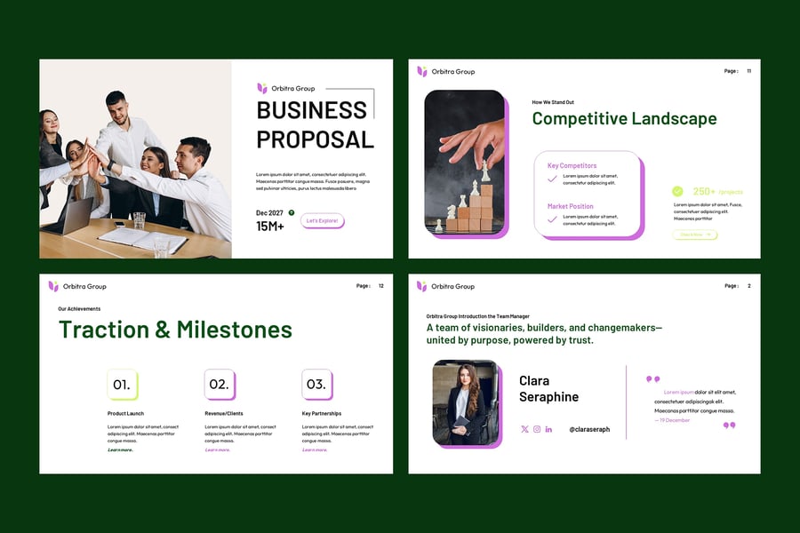 商业提案 Google 幻灯片演示模板是一款时尚、现代且专业的幻灯片,旨在帮助您自信清晰地阐述您的想法。这款模板非常适合初创公司、企业团队、企业家和代理机构,可确保您的商业提案兼具视觉吸引力和极强的说服力。凭借简洁的布局、可自定义的配色方案、基于矢量的图形和数据驱动的图表,您可以轻松调整每张幻灯片以匹配您的品牌形象。其完全可编辑的 Google 幻灯片格式使协作变得无缝快捷,非常适合在线会议、投资者演示、项目提案或客户入职会议。