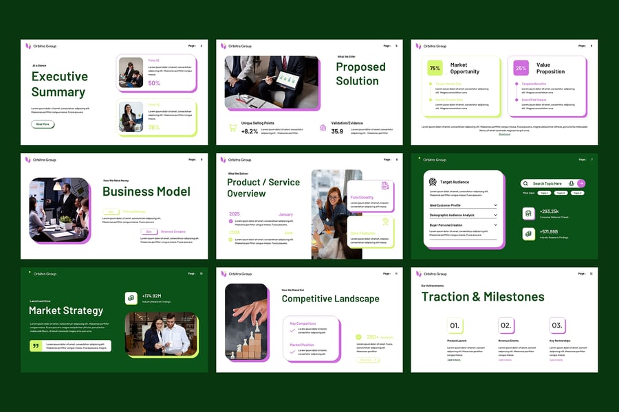 无论您是在准备初创企业融资方案、企业商业计划还是项目投资提案,此模板都能为您提供卓越的结构和设计,从而打动利益相关者并促成交易。使用此模板打造引人入胜的方案,其中包含专业设计的幻灯片,可展示您业务的各个关键方面,从公司概况到问题解决方案分析。其现代化的布局、可视化的图形和可编辑的图表,让您轻松讲述故事并有效地可视化数据。它可完全定制以适应任何行业,帮助您打造引人注目且卓有成效的方案。适用于初创企业创始人和企业家、商业顾问和代理机构、营销和销售团队、项目经理和企业高管。