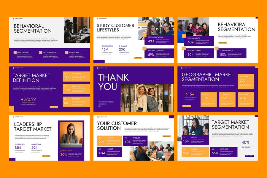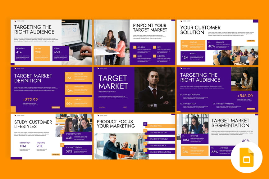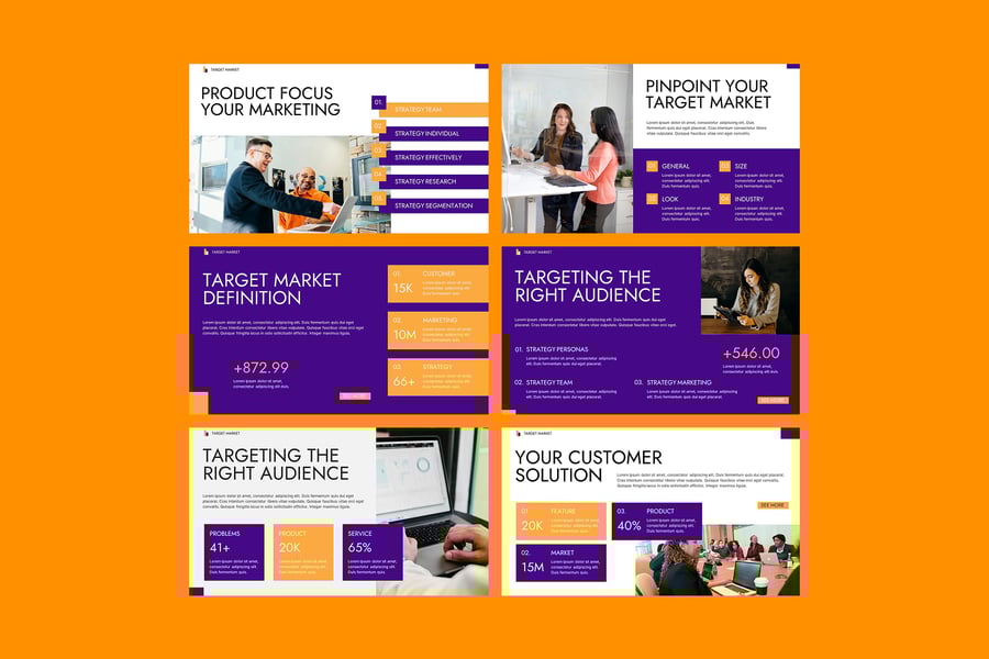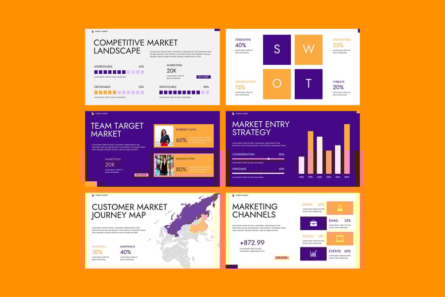 目标市场演示模板专为营销人员、品牌战略师、初创企业和业务开发人员量身定制,帮助他们清晰地定义和传达理想的客户画像和市场细分。该模板非常适合用于营销计划、品牌定位、投资者推介或产品发布策略,包含人口统计、心理统计、客户画像、市场细分、购买行为、竞争格局和受众痛点等重要部分。该模板采用现代简洁的美学设计,运用引人入胜的视觉效果、信息图表、用户画像和数据驱动的布局,帮助您有效地传达洞察。该模板完全可定制,您可以调整颜色、图像和内容以匹配您的品牌。无论您是要识别利基市场、展示客户研究成果,还是围绕关键目标协调团队,此模板都能让您轻松呈现专业且富有影响力的市场焦点概述。