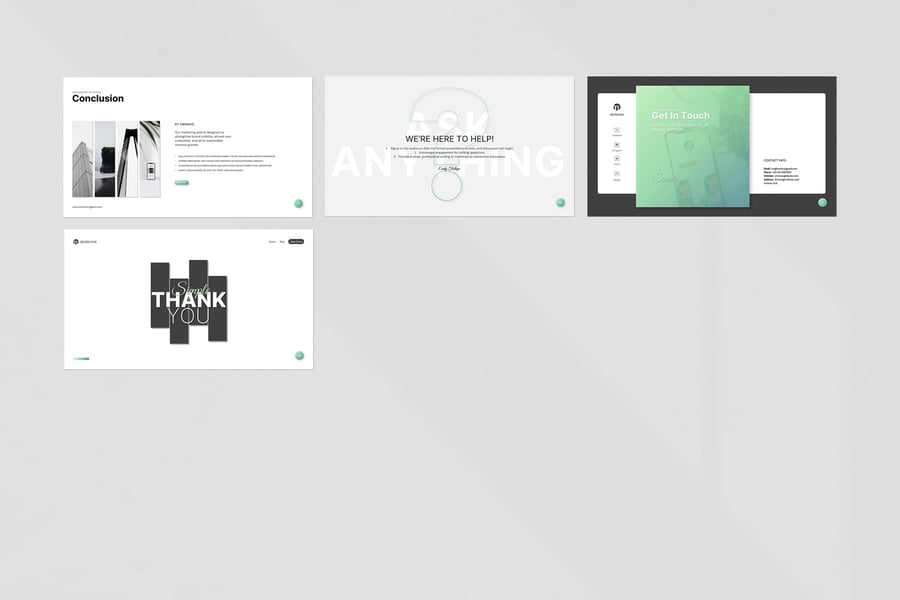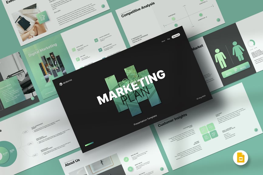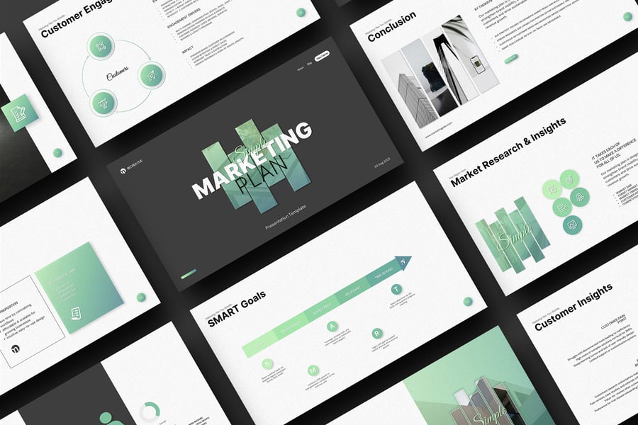 使用简洁的营销计划演示模板,以专业简洁的方式展示您的作品。这款模板设计简洁现代,功能强大,包含创意照片布局、信息图表、表格、矢量图标、图表以及大量实用功能,可将您的作品和公司简介提升到一个新的高度。
