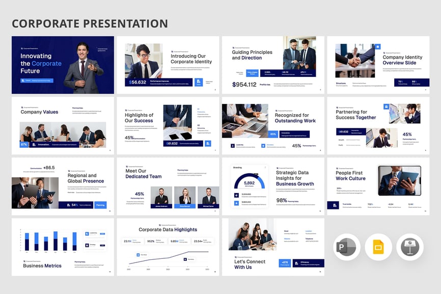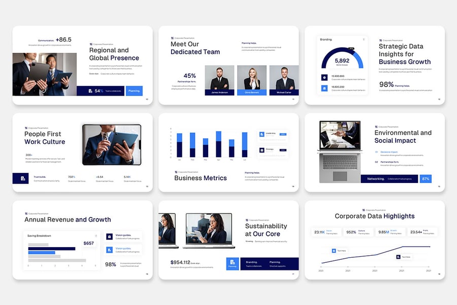 非常适合投资者演示文稿、年度报告、客户提案、内部战略评估和销售演示。简洁、现代、业务至上——此模板可将您的内容转化为影响力。