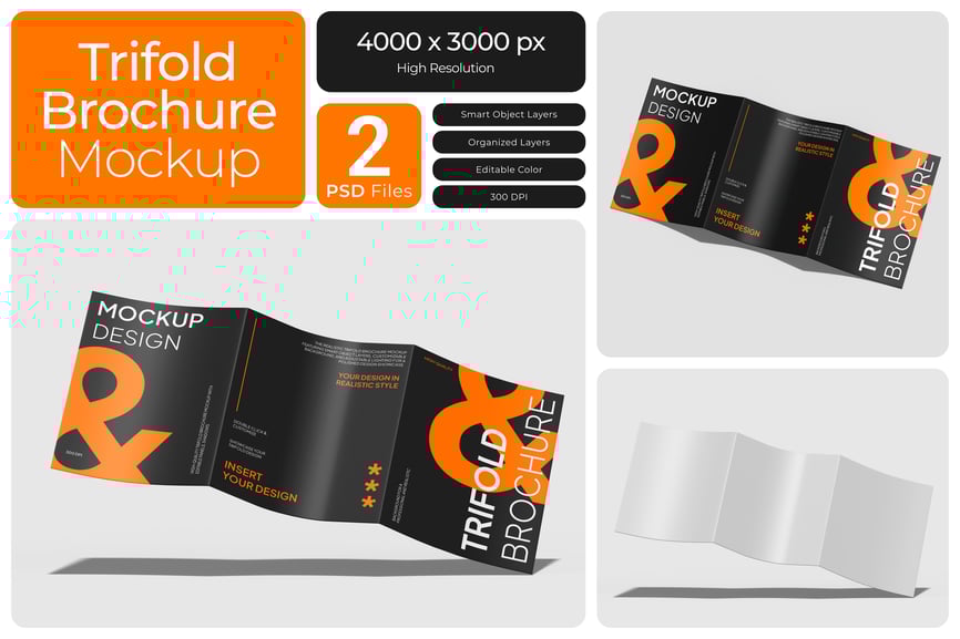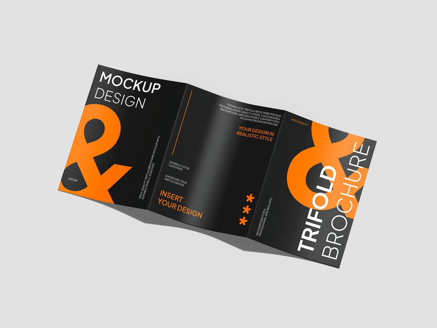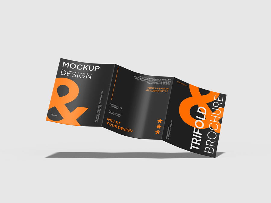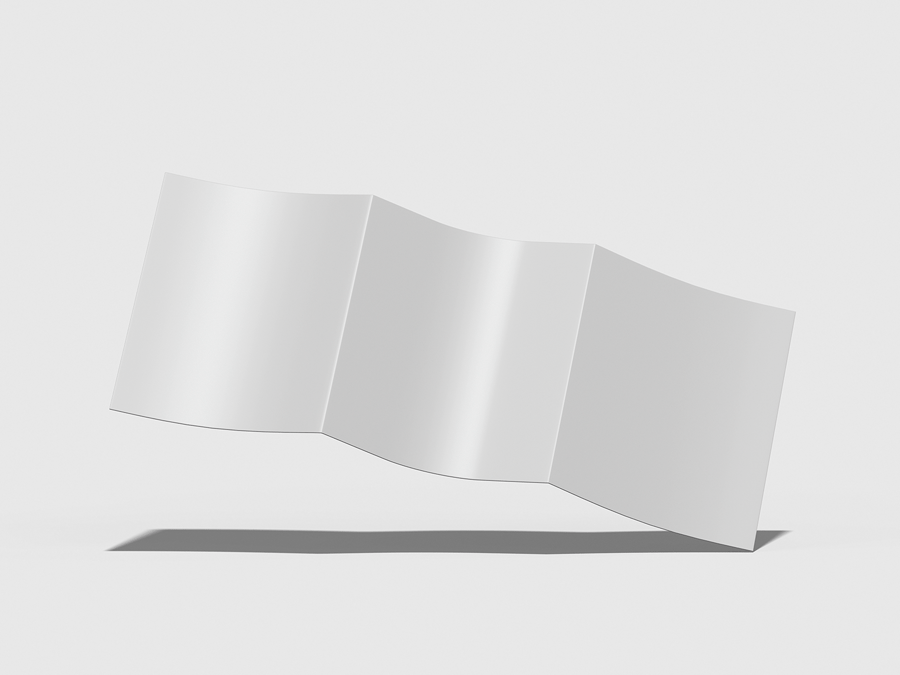 使用这款多功能的**三折宣传册样机**来展示您的布局或企业形象设计。这款样机非常适合用于公司简介、菜单、服务目录或宣传材料,其清晰的折叠和精准的尺寸,让您的三折页设计栩栩如生。