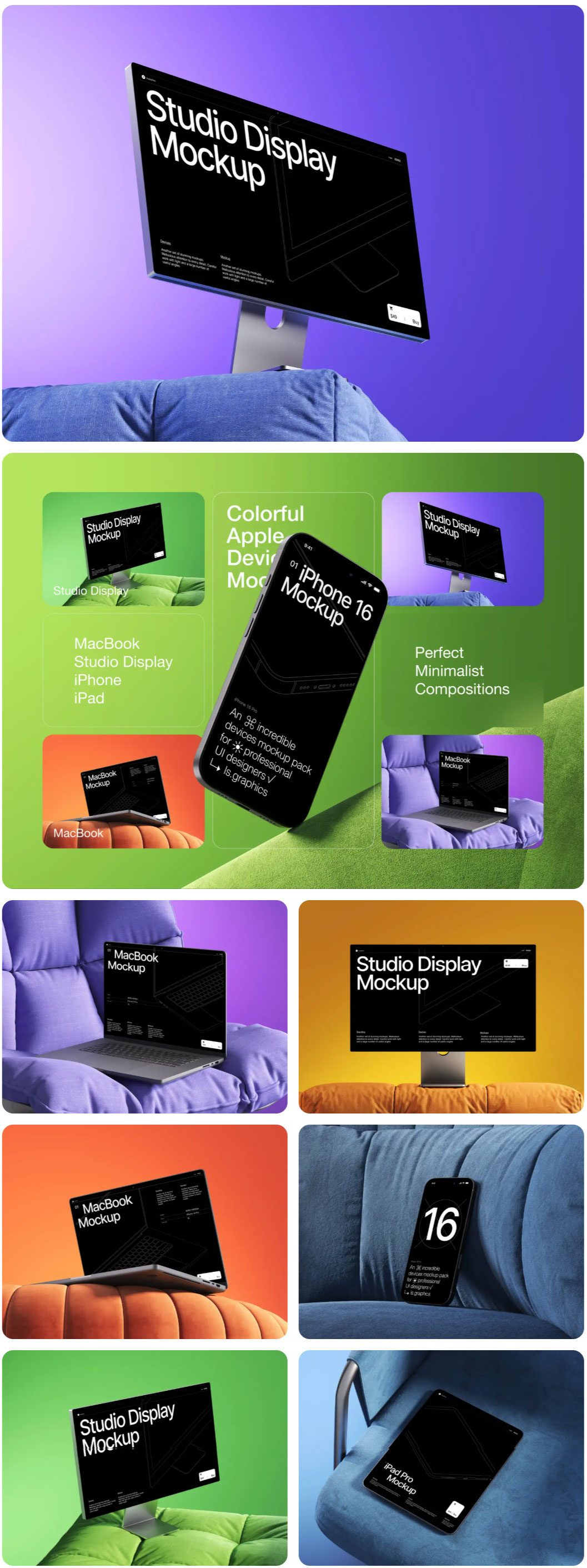 该系列包含 iPhone 16 Pro、MacBook、iPad Pro 和 Studio Display 的模型,并以大胆多彩的织物背景为背景。每款设备均采用柔软现代的织物精美呈现,并以醒目的紫色、橙色、绿色和蓝色调呈现,营造出温暖的视觉效果。这些高质量的模型将 Apple 的时尚科技与舒适、触感舒适的环境融为一体,非常适合生活方式品牌推广、App 展示以及需要营造亲切感和高端感的创意作品集。