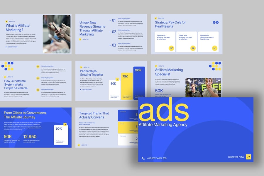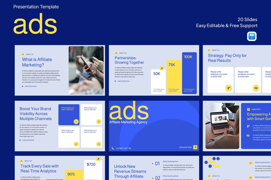 **联盟营销主题演讲模板** 旨在打造令人印象深刻的演示文稿,每张幻灯片均可自定义且易于使用,助您快速呈现精彩纷呈、令人印象深刻的演示文稿。无论是商业、教育还是创意项目,我们的模板都能确保您的内容风格鲜明、清晰易懂。
