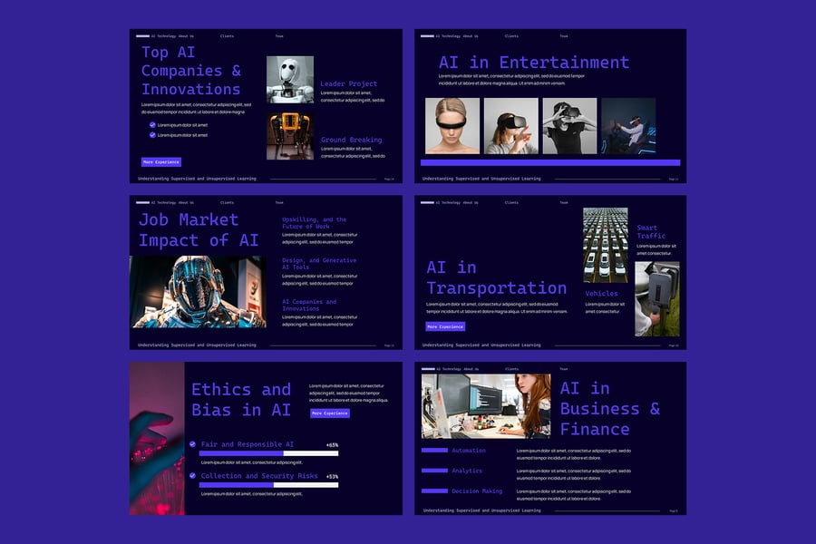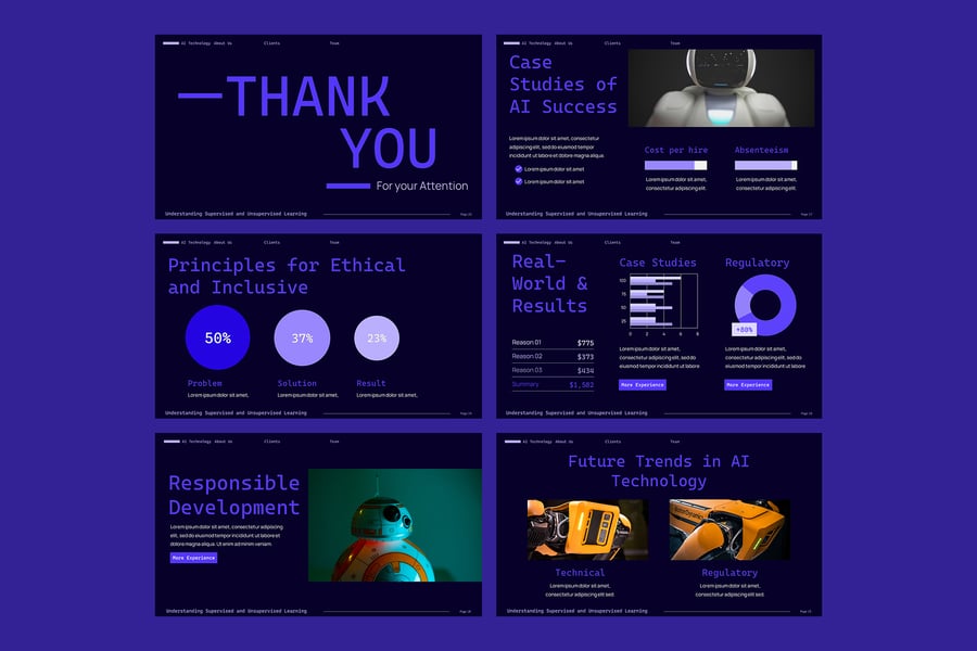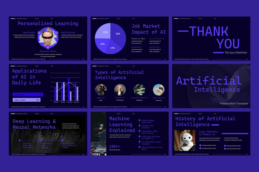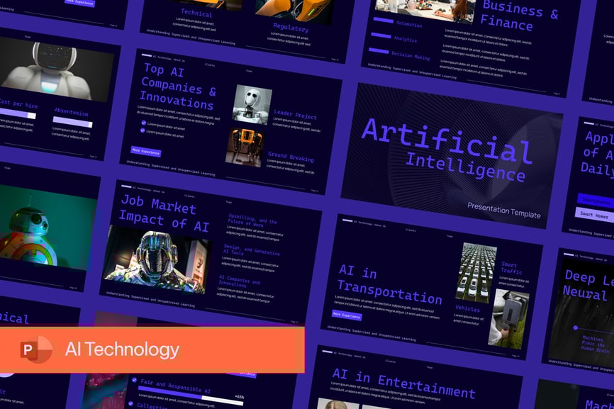 人工智能技术演示模板采用现代与未来主义相结合的设计,旨在突出人工智能领域的创新、应用和机遇。该模板非常适合科技公司、初创公司、研究人员、顾问和学术机构,包含人工智能简介、用例、机器学习模型、自动化优势、行业应用、数据分析、产品展示、市场趋势、挑战和未来创新等板块。该模板拥有流畅的布局、科技感十足的图形、未来主义的视觉效果和数据驱动的信息图表,有助于简化复杂的人工智能概念,同时保持专业前沿的外观。该模板完全可定制且功能多样,非常适合产品发布、投资者推介、研究报告、培训课程或技术会议,是传达人工智能驱动解决方案的强大功能和潜力的完美工具。