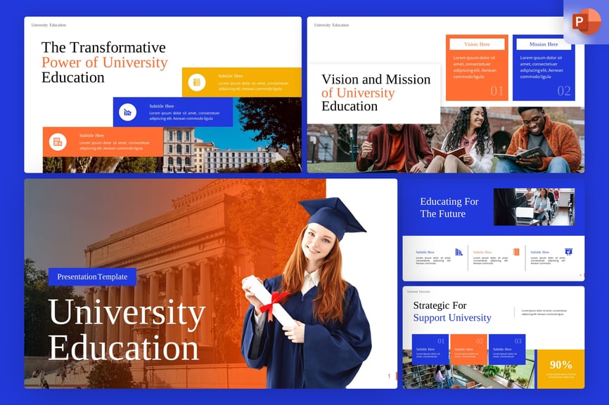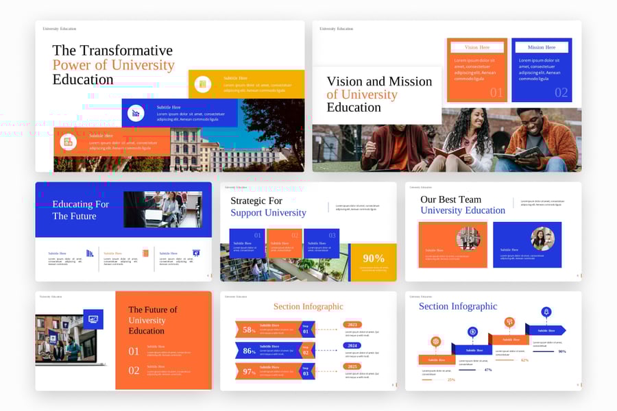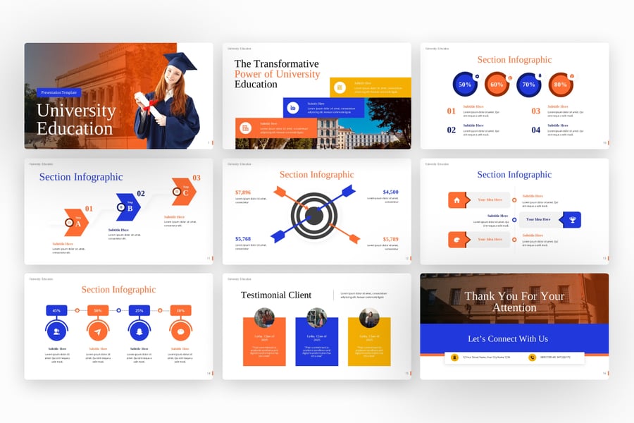 这个现代大学教育演示模板提供了专业且引人入胜的设计,并配有针对学术主题定制的彩色信息图表幻灯片。