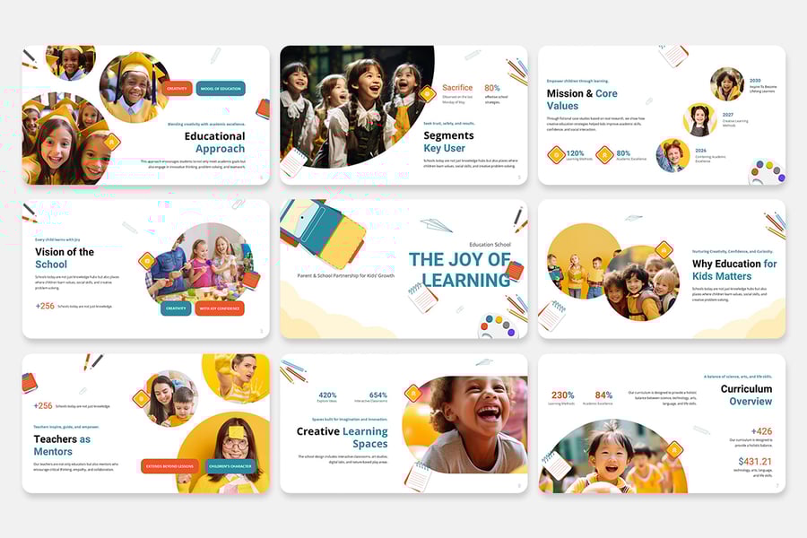 使用儿童教育学校演示模板,让学习变得生动有趣——这是一款现代、色彩丰富且完全可定制的演示文稿,旨在让教育更具吸引力和影响力。无论您是教师、学校管理员、教育顾问还是在线学习专业人士,此模板都能帮助您清晰、富有创意、自信地传达想法。
