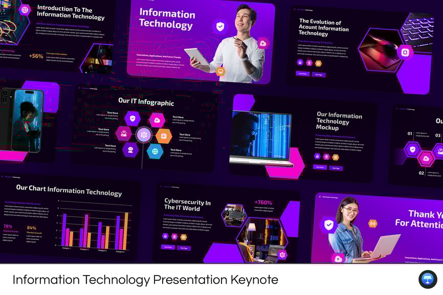 **信息技术 IT 主题演讲** 采用创意主题。此模板还能满足您的演示需求,提供各种主题和用途,以及更改文本、图像和颜色的功能。