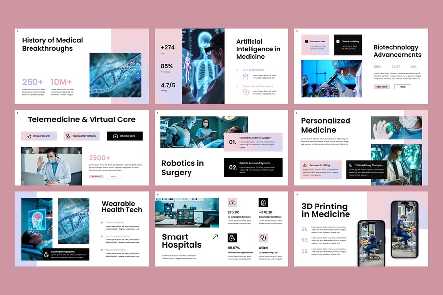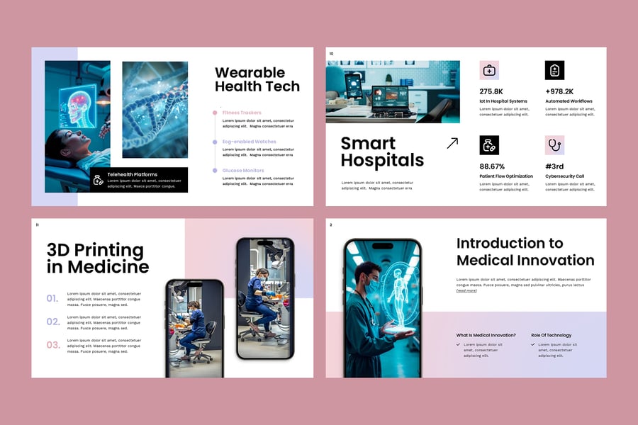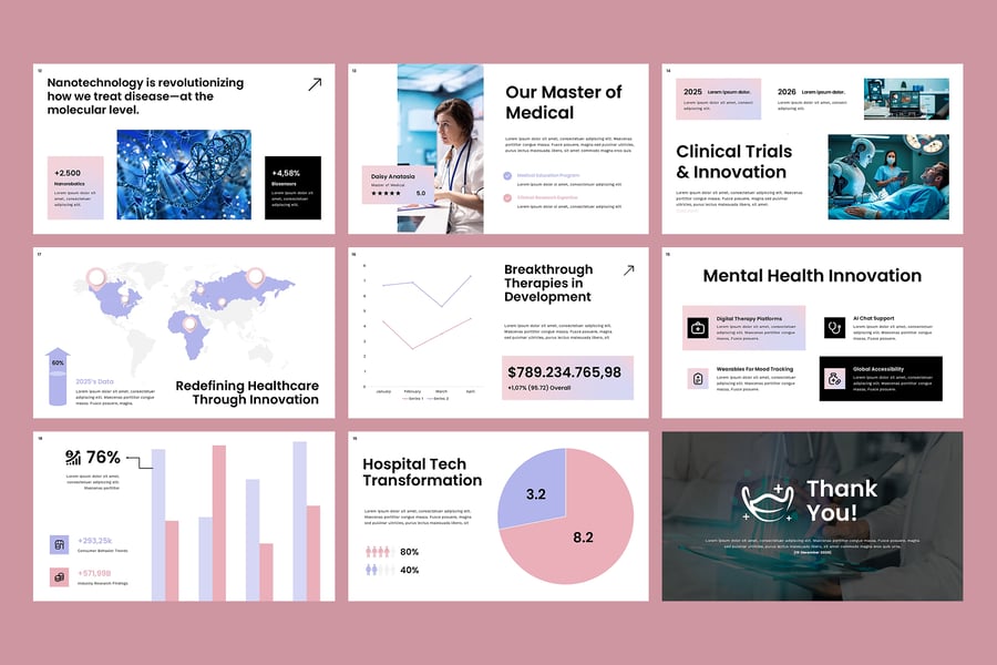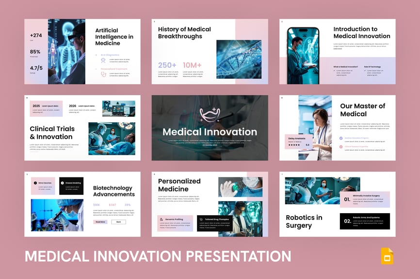 医疗创新 Google 幻灯片演示模板是一款简洁、现代且专业的演示设计,专为医疗保健、医学研究、制药、生物技术和临床创新项目打造。该模板非常适合医生、科学家、医疗初创公司和医院管理团队,可帮助您清晰地传递数据驱动的洞察、创新理念和医学突破,并带来视觉冲击。凭借完全可编辑的幻灯片、创意信息图表、数据图表和医疗主题图形,该模板可确保您的演示文稿看起来精美且引人入胜。其拖放式图像占位符、矢量图标和可调整大小的图形,即使非设计师也能轻松自定义。