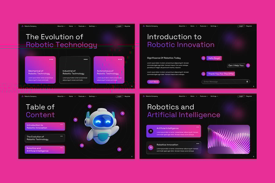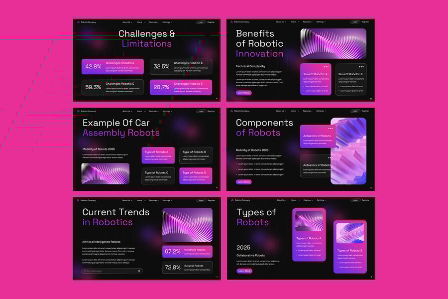 无论您是在推销机器人初创公司、在技术大会上发表主题演讲,还是展示创新战略,此模板都能帮助您以简洁、专业且视觉动感的方式传达复杂的想法。此模板提供精心制作的幻灯片,用于展示公司概况以及问题和解决方案分析。它拥有现代化的设计、引人入胜的视觉效果和可自定义的图表,可增强叙事和数据可视化。此模板完全适用于任何行业,可帮助您创建引人入胜的推介,吸引眼球并取得成果。此模板适用于机器人技术、人工智能、自动化和科技行业。